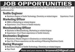 Vacant posts including textile engineer, merchandising officer, electronics engineer, marketing officer and dyeing manager are announced in Multinational Company Lahore, lahore Punjab Pakistan as per 9 December 2024 advertisement in daily The News Newspaper. Educational qualifications required Bachelor and MBA etc.