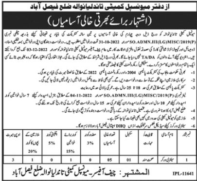 Municipal Committee invites applications for job positions advertised in daily Jang dated 14 November 2022 for following vacancies in Tandlianwala, faisalabad and tandlianwala Punjab Pakistan.