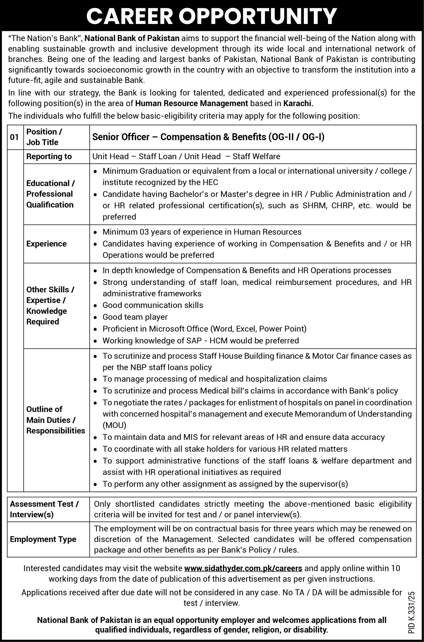 National Bank of Pakistan NBP jobs advertisement dated about 27 July 2025 in daily Other Newspaper invites application for the vacant post of officer compensation benefits in Karachi, karachi Sindh Pakistan. Educational qualifications required Bachelor and Master etc.