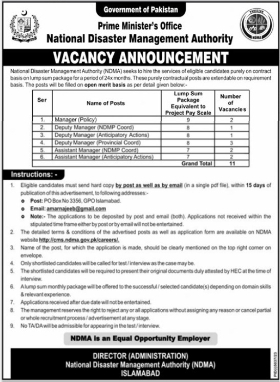 Prime Minister Office Islamabad, islamabad Islamabad Pakistan invites applications from eligible candidates for the post of manager policy, deputy manager provincial coord, deputy manager ndmp coord, deputy manager anticipatory actions, assistant manager anticipatory actions and assistant manager ndmp coord as per advertisement of February 24, 2024 published in daily Jang Newspaper. Candidates with Bachelor and Master etc. educational background will be preferred.