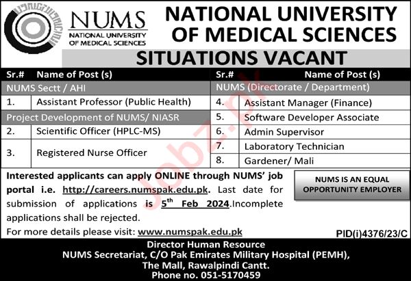 National University of Medical Sciences NUMS Rawalpindi, rawalpindi Punjab Pakistan invites applications from eligible candidates for the post of gardener, admin supervisor, registered nurse officer, software developer associate, assistant manager finance, assistant professor public health, mali, scientific officer and laboratory technician as per advertisement of January 21, 2024 published in daily Nawaiwaqt Newspaper. Preferred Education is Primary, Bachelor, Middle, Others, MBBS and Master etc.