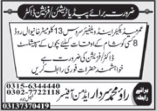 Omar Medicare Welfare Services invites applications for job positions advertised in daily Khabrain dated 25 November 2025 for following vacancies in Multan, multan Punjab Pakistan.