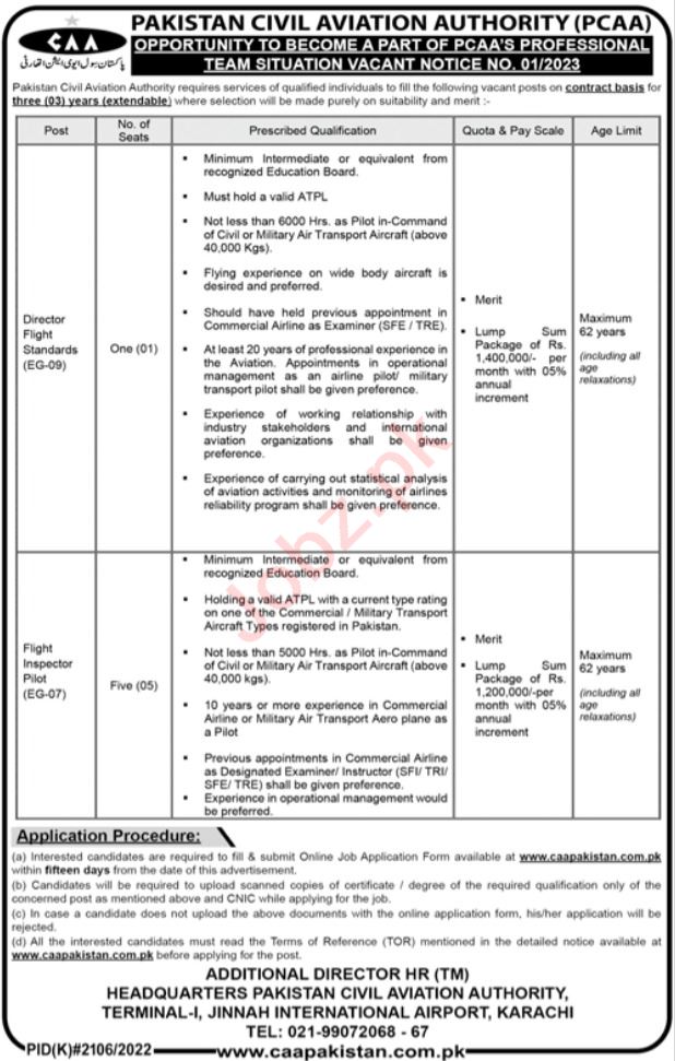 Vacant posts including director flight standards and flight inspector pilot are announced in Pakistan Civil Aviation Authority CAA Karachi, karachi Sindh Pakistan as per 22 January 2023 advertisement in daily Jang Newspaper. Others and Intermediate etc. educational qualification will be preferred.