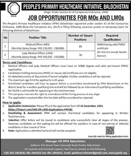 Vacant posts including medical officer and lady medical officer are announced in Peoples Primary Healthcare Initiative Quetta, quetta Balochistan Pakistan as per 29 November 2025 advertisement in daily Jang Newspaper. Preferred Education is MBBS etc.
