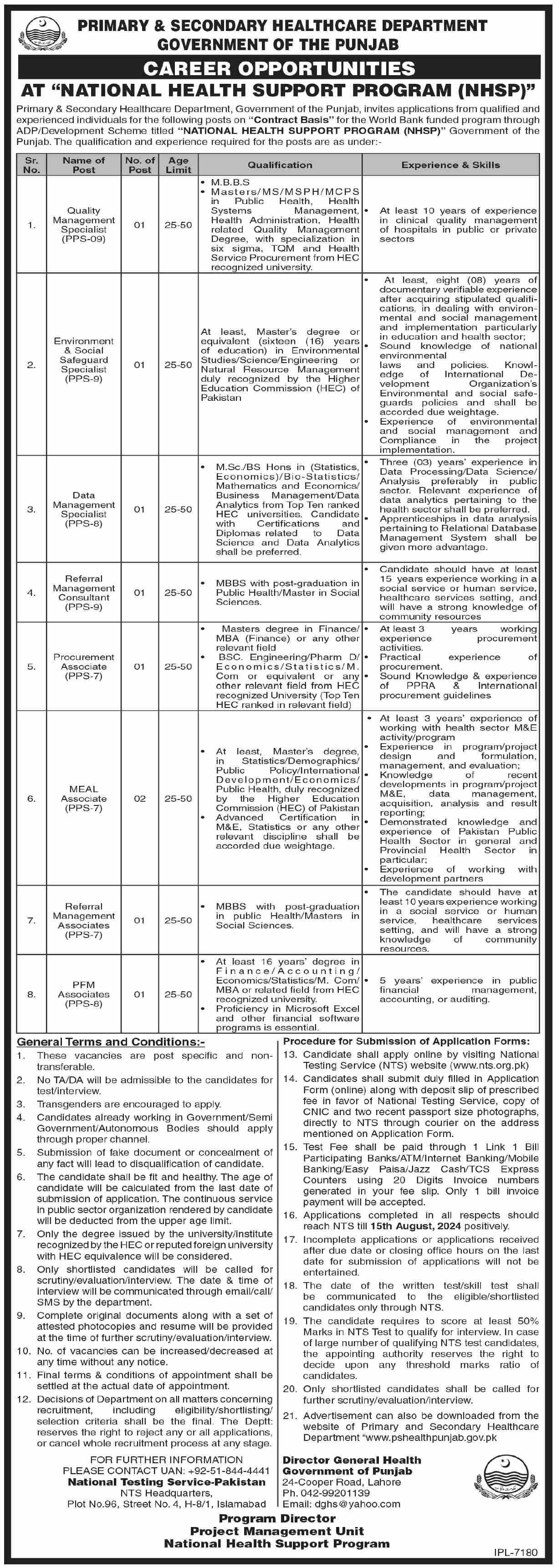 Primary & Secondary Healthcare Department Lahore, lahore Punjab Pakistan invites applications from eligible candidates for the post of data management specialist, referral management associate, procurement associate, pfm associate, meal associate, environment social safeguard specialist, referral management consultant and quality management specialist as per advertisement of August 3, 2024 published in daily Dawn Newspaper. Persons with M.sc, MBBS, MBA and Master etc. education can apply.