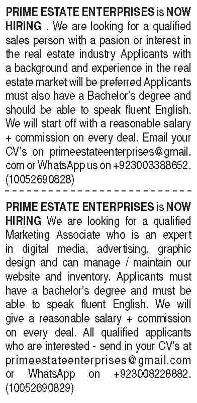 Prime Estate Enterprises is looking for candidates for following posts as per job advertisement published in daily Dawn Newspaper of April 19, 2022 for location Karachi, karachi Sindh Pakistan: