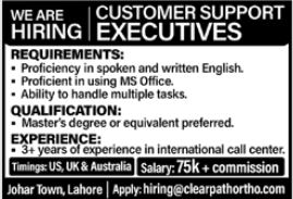 Private Company Lahore, lahore Punjab Pakistan invites applications from eligible candidates for the post of customer support executive as per advertisement of January 19, 2024 published in daily Jang Newspaper. Educational qualifications required Master and MS etc.