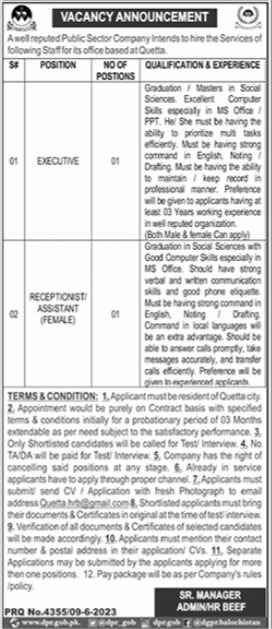 Public Sector Company jobs advertisement dated about 10 June 2023 in daily Jang Newspaper invites application for the vacant post of female receptionist, executive and female assistant in Quetta, quetta Balochistan Pakistan. Educational qualifications required Bachelor and Master etc.