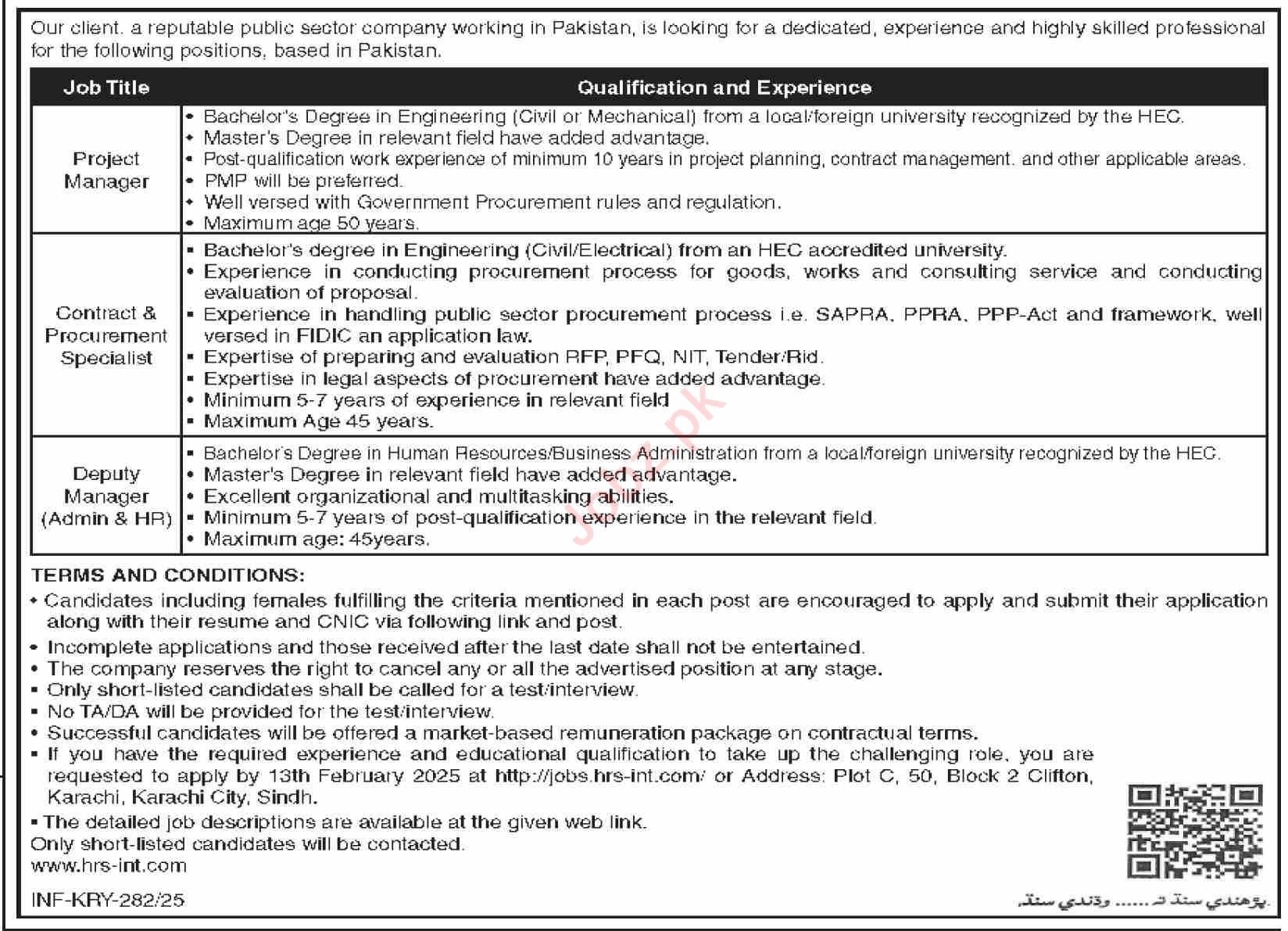 Public Sector Company is looking for candidates for following posts as per job advertisement published in daily Dawn Newspaper of January 26, 2025 for location Karachi, karachi Sindh Pakistan: