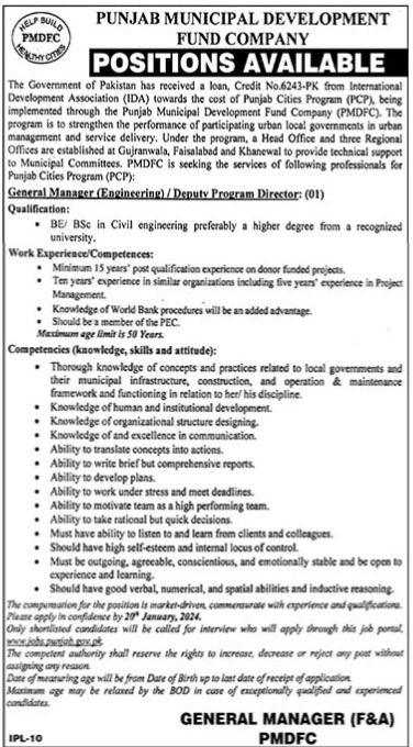 Vacant posts including general manager engineering and deputy program director are announced in Punjab Municipal Development Fund Company PMDFC Lahore, lahore Punjab Pakistan as per 2 January 2024 advertisement in daily The News Newspaper. Educational qualifications required Bachelor and B.E etc.