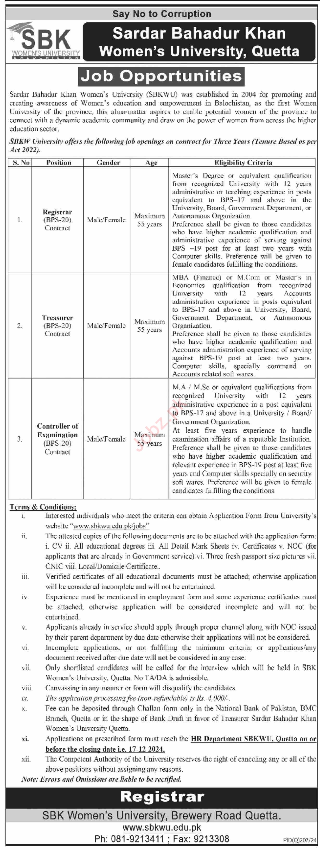 Sardar Bahadur Khan Women University SBKWU jobs advertisement dated about 17 November 2024 in daily Dawn Newspaper invites application for the vacant post of controller of examination, treasurer and registrar in Quetta, quetta Balochistan Pakistan. Preferred Education is M.sc, MBA, Master and MA etc.