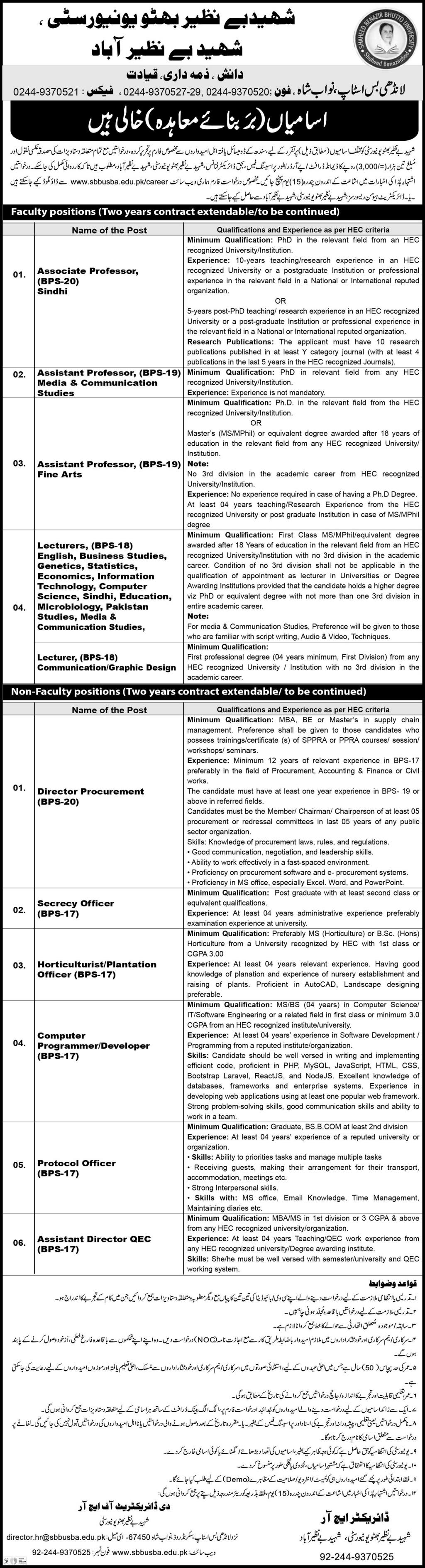 Shaheed Benazir Bhutto University Nawabshah, nawabshah Sindh Pakistan invites applications from eligible candidates for the post of lecturer statistics, plantation officer, assistant professor, director procurement, lecturer computer science, assistant director qec, lecturer information technology, lecturer education, lecturer microbiology, lecturer communication, protocol officer, lecturer genetics, lecturer, secrecy officer, developer, lecturer pakistan studies, lecturer english, computer programmer, assistant professor fine arts, lecturer media communication studies, associate professor sindhi, lecturer business studies, horticulturist, lecturer economics, associate professor, lecturer sindhi, lecturer graphic design and assistant professor media communication studies as per advertisement of May 18, 2024 published in daily Express Newspaper. Preferred Education is Master, B.com, MS, MBA, Phd and Mphil etc.