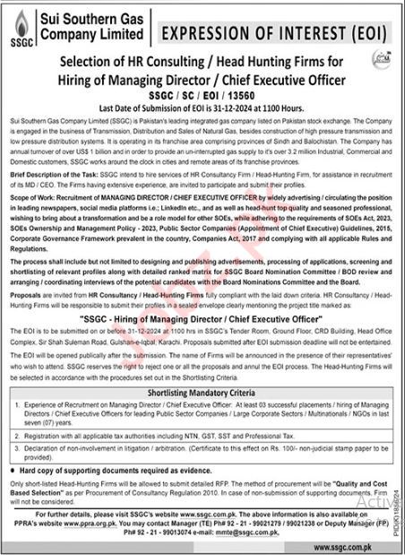 Vacant posts including chief executive officer and managing director are announced in Sui Southern Gas Company Limited SSGC Karachi, karachi Sindh Pakistan as per 16 December 2024 advertisement in daily The News Newspaper. Master and Bachelor etc. educational qualification will be preferred.