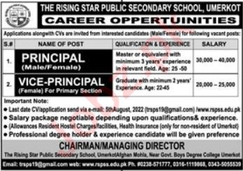 The Rising Star Public Secondary School Umerkot, umerkot Sindh Pakistan invites applications from eligible candidates for the post of principal and vice principal as per advertisement of August 2, 2022 published in daily Kawish Newspaper. Master and Bachelor etc. educational qualification will be preferred.