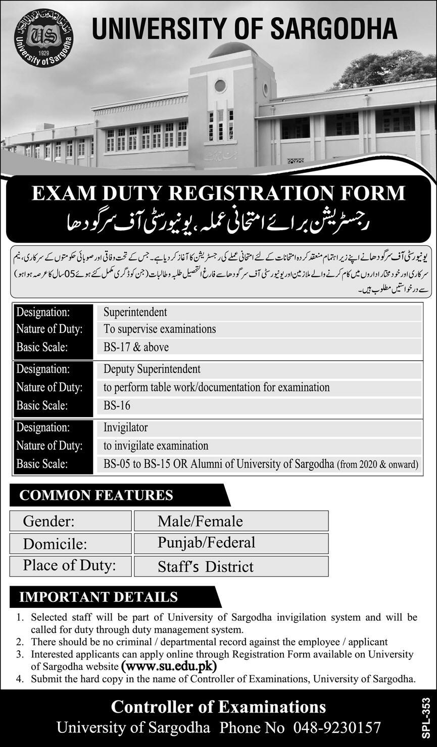 University of Sargodha UOS University Road Sargodha, sargodha Punjab Pakistan invites applications from eligible candidates for the post of invigilator, deputy superintendent and superintendent as per advertisement of February 23, 2025 published in daily Express Newspaper. Persons with Bachelor and Intermediate etc. education can apply.