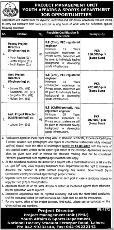 Vacancies in Youth Affairs & Sports Department Advertisement August 2025