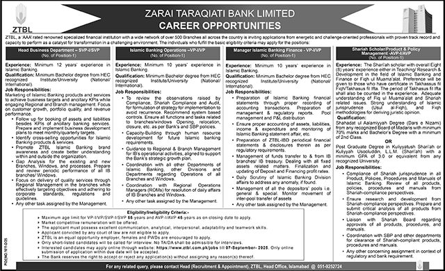 Zarai Taraqiati Bank Limited ZTBL invites applications for job positions advertised in daily Nawaiwaqt dated 24 August 2025 for following vacancies in Islamabad, islamabad Islamabad Pakistan.