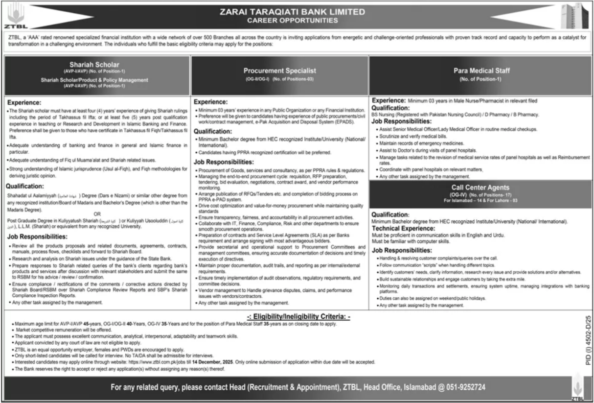 Zarai Taraqiati Bank Limited ZTBL jobs advertisement dated about 30 November 2025 in daily Dunya Newspaper invites application for the vacant post of procurement specialist, call center agent, shariah scholar and para medical staff in Islamabad, islamabad Islamabad Pakistan. Persons with Master and Bachelor etc. education can apply.