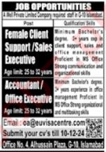 Vacant posts including accountant, female client support, office executive and sales executive are announced in Private Limited Company Islamabad, islamabad Islamabad Pakistan as per 8 December 2024 advertisement in daily Jang Newspaper. Candidates with Bachelor etc. educational background will be preferred.