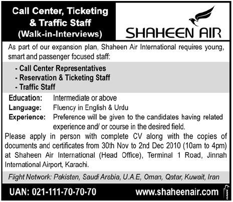 Jobs For Call Center,Ticketing,Traffic Staff In Shaheen Air