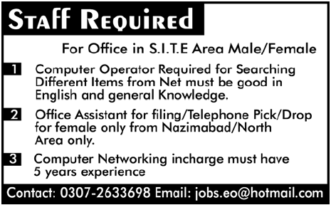 Jobs For Computer Operator,Office Assistant,etc. In S.I.T.E.