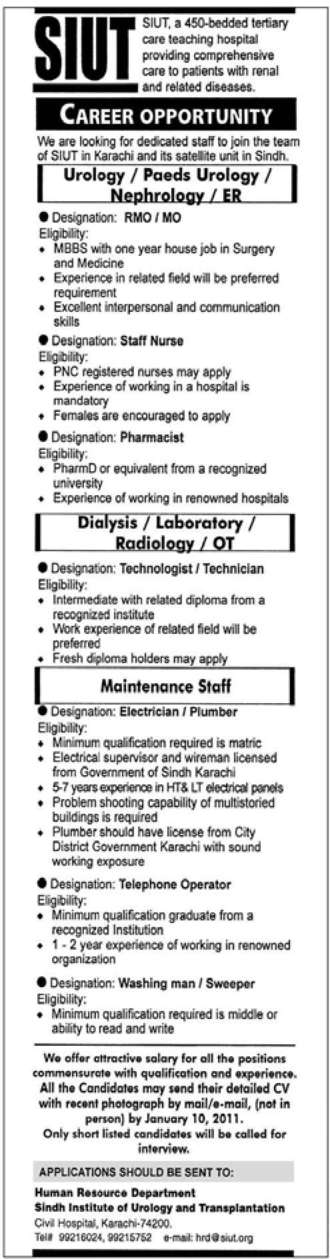 JObs for Mediacal Staff in SUIT Hospital Karachi