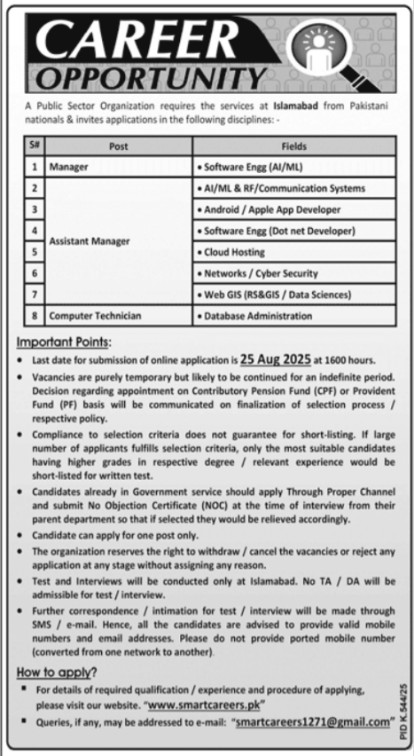 Vacant posts including manager, assistant manager and computer technician are announced in Public Sector Organization Islamabad, islamabad Islamabad Pakistan as per 11 August 2025 advertisement in daily Jang Newspaper. Persons with Bachelor and Master etc. education can apply.