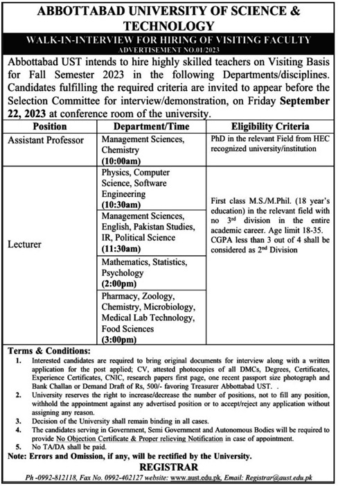 Abbottabad University of Science and Technology Abbottabad, abbottabad Khyber Pakhtunkhwa KPK Pakistan invites applications from eligible candidates for the post of lecturer zoology, lecturer software engineering, lecturer pharmacy, lecturer management science, lecturer pakistan studies, lecturer food sciences, lecturer mathematics, lecturer psychology, lecturer medical lab technology, lecturer physics, assistant professor management sciences, lecturer political science, lecturer computer science, lecturer english, lecturer microbiology, lecturer, lecturer statistics, lecturer chemistry, assistant professor and assistant professor chemistry as per advertisement of September 17, 2023 published in daily Aaj Newspaper. Mphil, MS and Phd etc. educational qualification will be preferred.