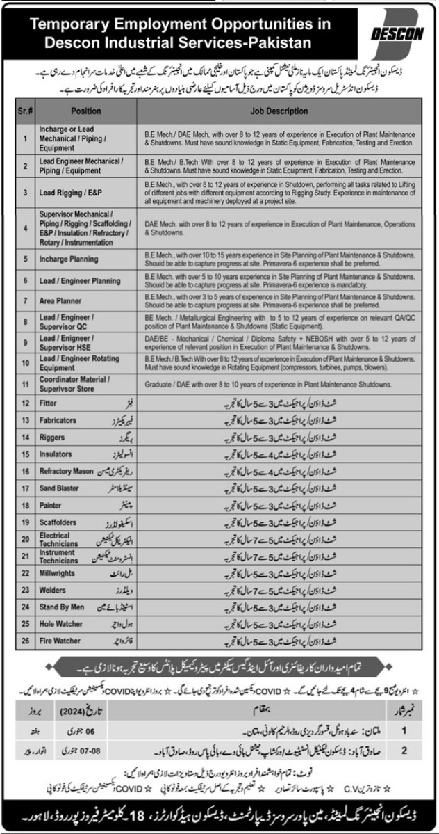 Descon Engineering Limited invites applications for job positions advertised in daily Kawish dated 1 January 2024 for following vacancies in Lahore, lahore Punjab Pakistan.