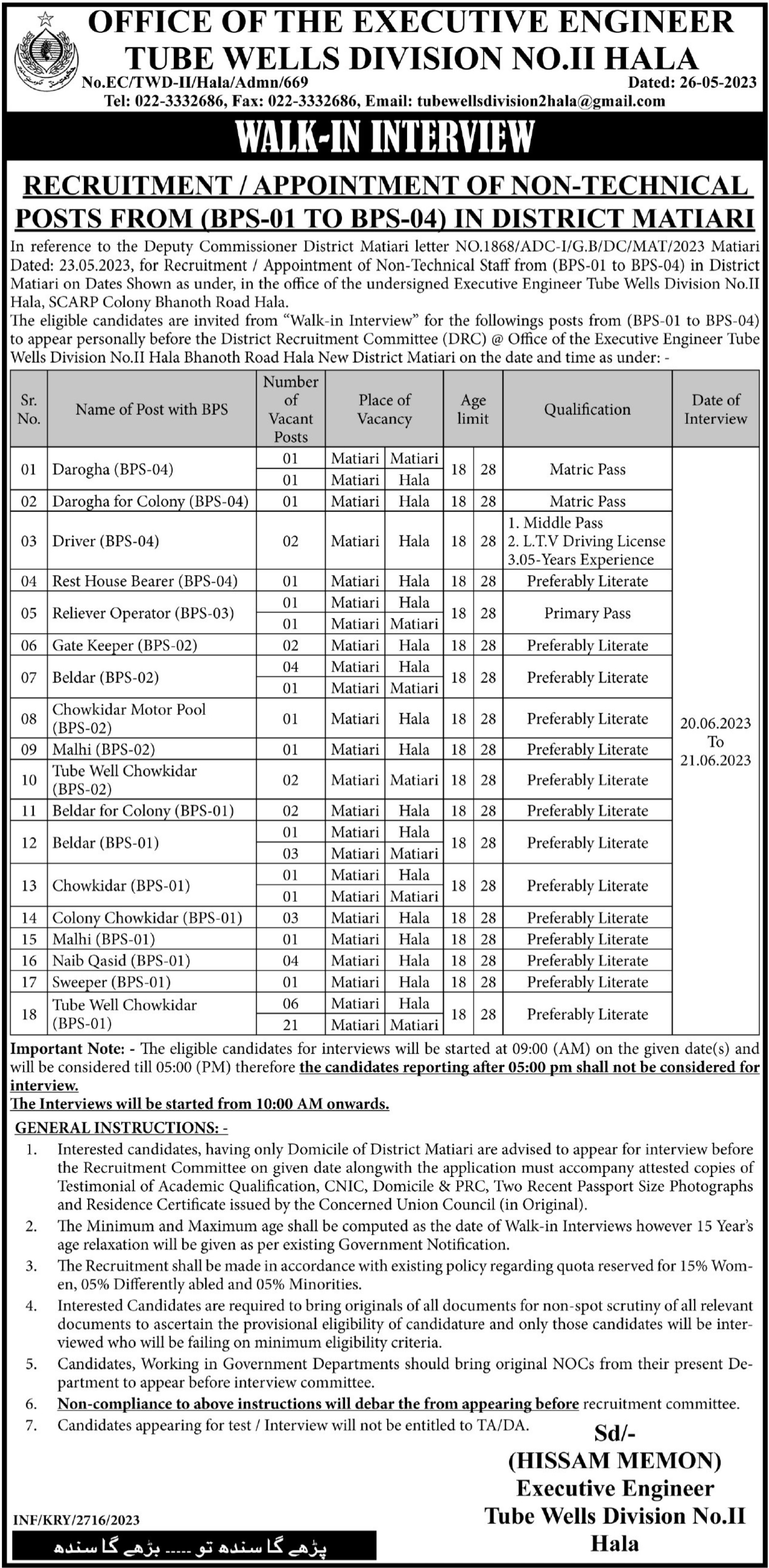 Tubewells Division jobs advertisement dated about 5 July 2023 in daily Express Tribune Newspaper invites application for the vacant post of naib qasid, beldar, rest house bearer, reliever operator, darogha for colony, colony chowkidar, darogha, gate keeper, tubewell chowkidar, mali, beldar for colony, chowkidar motor pool, chowkidar, sweeper and driver in Matiari, matiari Sindh Pakistan. Persons with Middle, Matric and Primary etc. education can apply.