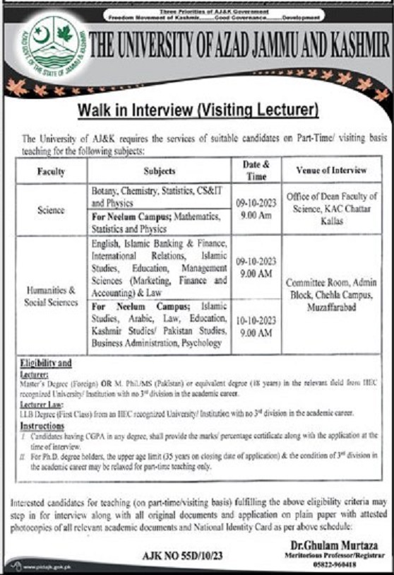 The University of Azad Jammu and Kashmir Muzaffarabad, muzaffarabad AJK Pakistan invites applications from eligible candidates for the post of lecturer law, lecturer islamic banking finance, lecturer education, lecturer statistics, lecturer english, lecturer pakistan studies, lecturer kashmir studies, lecturer international relations, lecturer islamic studies, lecturer management sciences, lecturer physics, lecturer botany, lecturer business administration, lecturer finance accounting, lecturer chemistry, lecturer psychology and visiting lecturer as per advertisement of October 4, 2023 published in daily Mahasib Newspaper. Persons with MS, Mphil and Phd etc. education can apply.