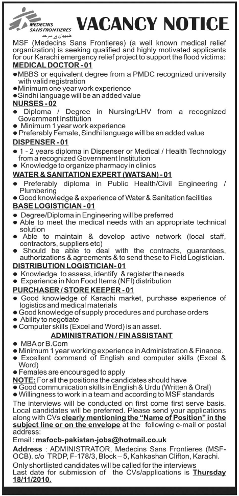 Jobs Medical Doctor Etc. In Medicines Sans Frontiers Karachi