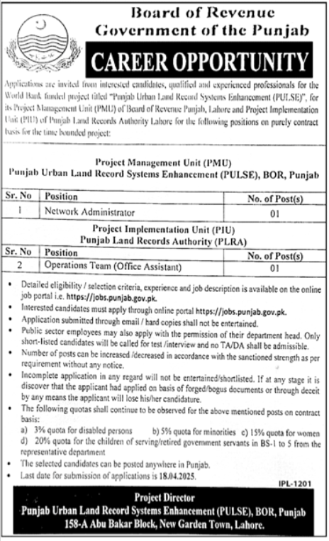 Board of Revenue invites applications for job positions advertised in daily Jang dated 30 March 2025 for following vacancies in New Garden Town Lahore, lahore Punjab Pakistan.