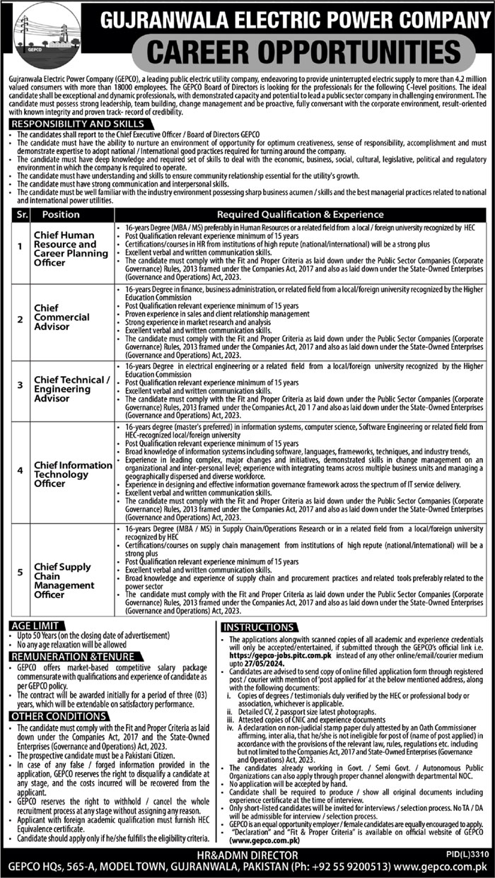 Gujranwala Electric Power Company GEPCO jobs advertisement dated about 25 April 2024 in daily Roznama 92 News Newspaper invites application for the vacant post of chief commercial advisor, chief technical, chief information technology officer, chief human resource career planning officer, chief supply chain management officer and chief technical engineering advisor in Gujranwala, gujranwala Punjab Pakistan. Preferred Education is Bachelor, Master and MS etc.