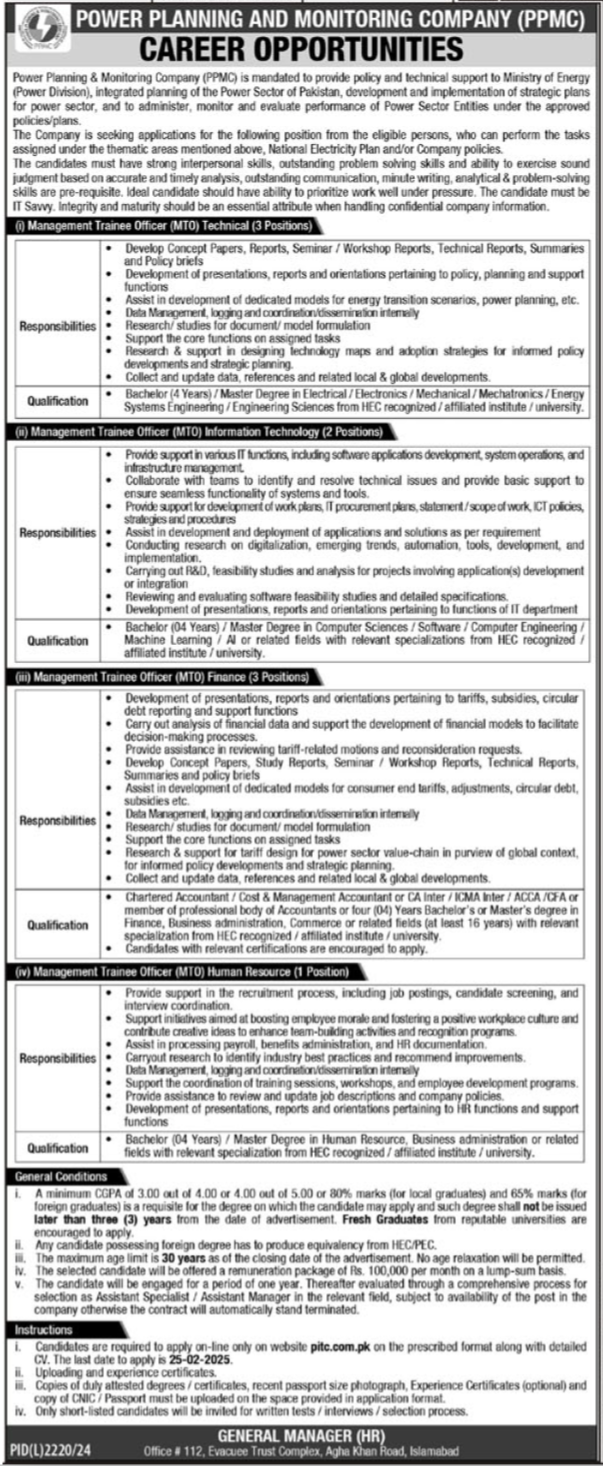 Power Planning and Monitoring Company Islamabad, islamabad Islamabad Pakistan invites applications from eligible candidates for the post of Management Trainee Finance, Management Trainee Officer Information Technology, Management Trainee Officer Technical and Management Trainee Officer Human Resource as per advertisement of February 10, 2025 published in daily K2 Newspaper. Educational qualifications required Bachelor, MS and Master etc.