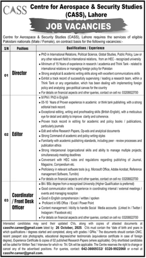 Centre For Aerospace & Security Studies CASS is looking for candidates for following posts as per job advertisement published in daily The News Newspaper of October 5, 2025 for location Lahore, lahore Punjab Pakistan: