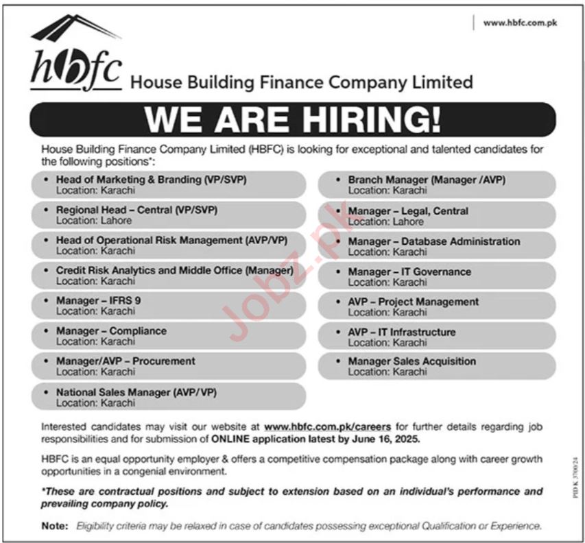 House Building Finance Company Limited HBFCL invites applications for job positions advertised in daily The News dated 1 June 2025 for following vacancies in Lahore, lahore Punjab Pakistan.