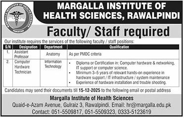 Margalla Institute of Health Sciences invites applications for job positions advertised in daily The News dated 7 December 2025 for following vacancies in Rawalpindi, rawalpindi Punjab Pakistan.