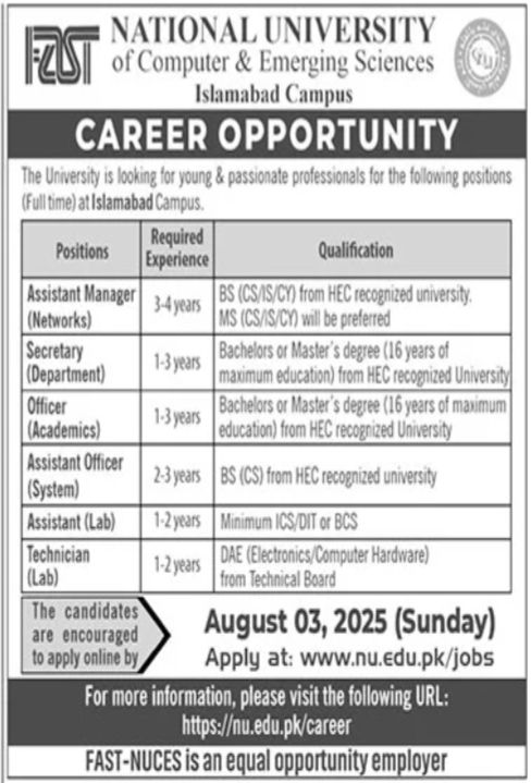 National University of Computer & Emerging Sciences jobs advertisement dated about 27 July 2025 in daily The News Newspaper invites application for the vacant post of technician lab, assistant lab, assistant manager networks, officer academics, assistant officer system and secretary in Islamabad, islamabad Islamabad Pakistan. Persons with Intermediate, Bachelor, Master and DAE etc. education can apply.