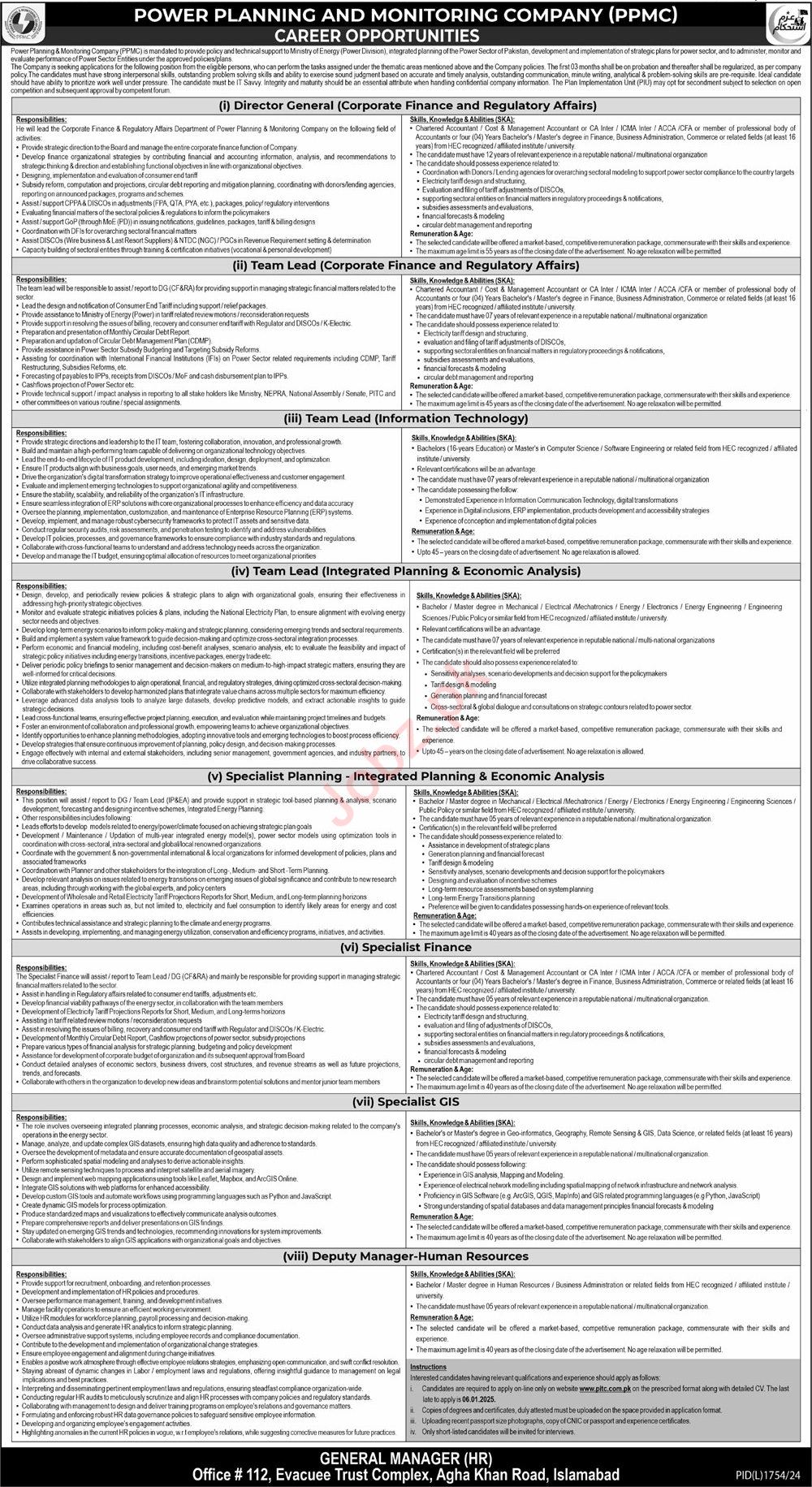 Power Planning and Monitoring Company jobs advertisement dated about 22 December 2024 in daily Ausaf Newspaper invites application for the vacant post of team lead corporate finance regulatory affairs, team lead information technology, specialist finance, deputy manager human resource, specialist gis, specialist planning, team integrated planning economic analysis and director general in Islamabad, islamabad Islamabad Pakistan. Educational qualifications required Master and Bachelor etc.