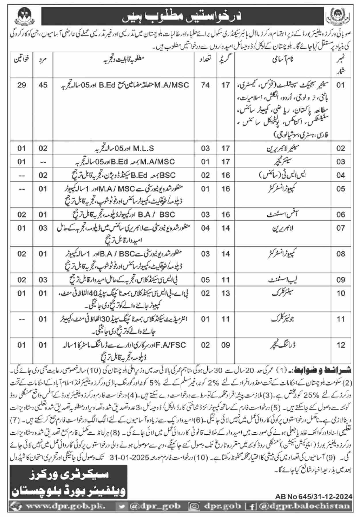 Workers Welfare Board jobs advertisement dated about 1 January 2025 in daily Dawn Newspaper invites application for the vacant post of sst science, lab assistant, teacher, office assistant, computer instructor, drawing master, clerk, librarian and subject specialist in Quetta, quetta Balochistan Pakistan. Persons with M.sc, Intermediate, BA and MA etc. education can apply.