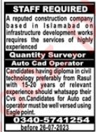 Vacant posts including autocad operator and quantity surveyor are announced in Construction Company Islamabad, islamabad Islamabad Pakistan as per 23 July 2023 advertisement in daily Jang Newspaper. Candidates with Bachelor, Master and Others etc. educational background will be preferred.