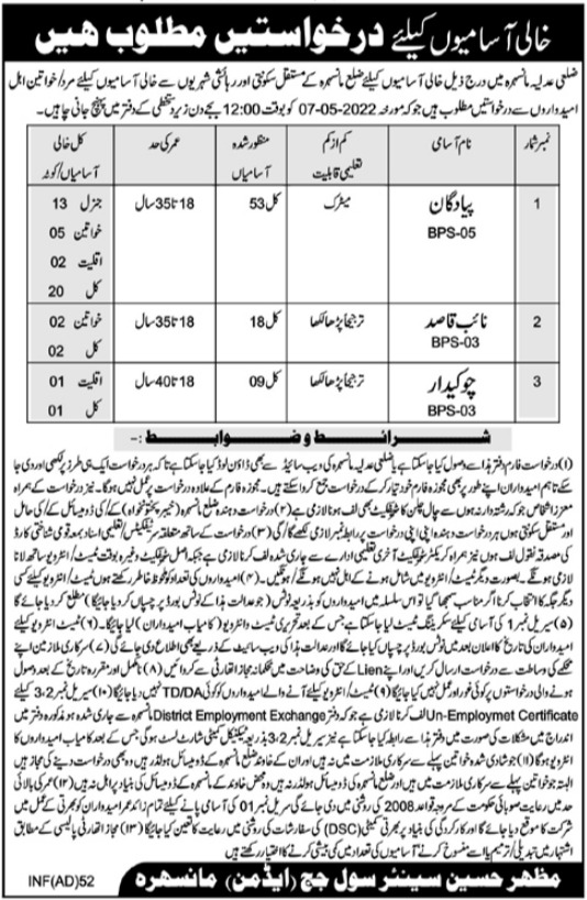 Vacant posts including naib qasid, chowkidar and piyadgan are announced in District Court Mansehra, mansehra Khyber Pakhtunkhwa KPK Pakistan as per 7 April 2022 advertisement in daily Aaj Newspaper. Candidates with Matric and Primary etc. educational background will be preferred.