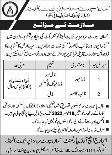 Vacant posts including naib qasid and driver are announced in Kisan Support Services Pvt Limited Islamabad, islamabad Islamabad Pakistan as per 4 November 2022 advertisement in daily Express Newspaper. Preferred Education is Middle etc.