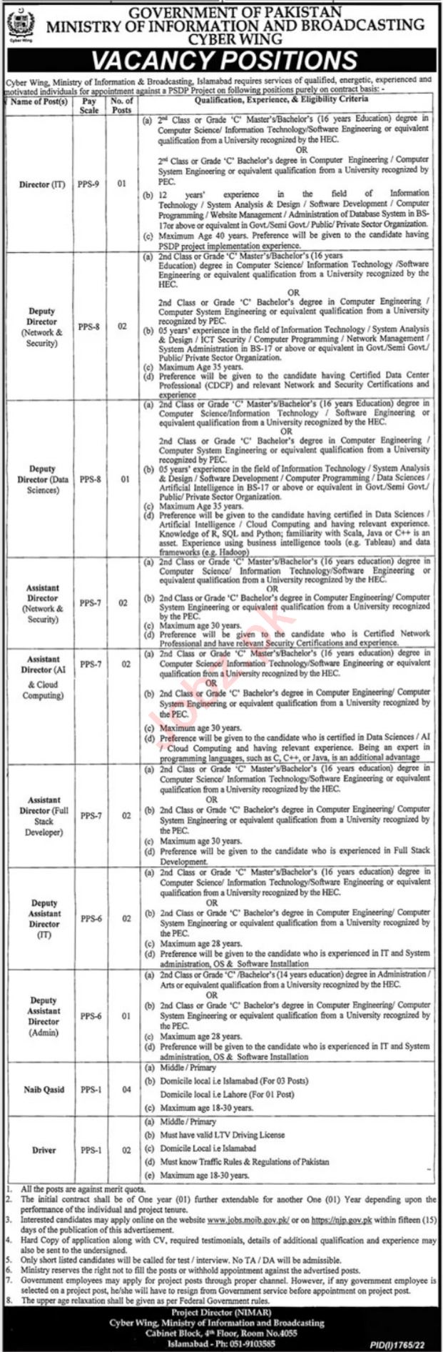 Ministry of Information and Broadcasting jobs advertisement dated about 18 September 2022 in daily Jang Newspaper invites application for the vacant post of director it, deputy director, deputy assistant director admin, deputy director data sciences, driver, naib qasid, deputy assistant director it and assistant director full stack developer in Islamabad, islamabad Islamabad Pakistan. Educational qualifications required Bachelor, Master, Middle and Primary etc.