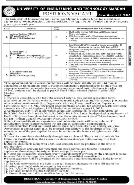 University of Engineering and Technology UET invites applications for job positions advertised in daily The News dated 31 July 2023 for following vacancies in Mardan, mardan Khyber Pakhtunkhwa KPK Pakistan.
