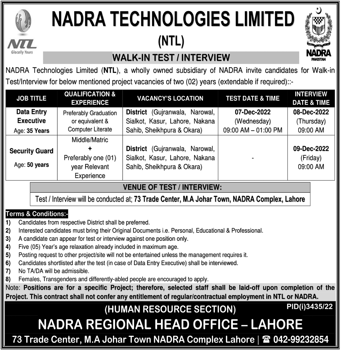 Nadra Technologies Limited NTL is looking for candidates for following posts as per job advertisement published in daily Nawaiwaqt Newspaper of December 1, 2022 for location Lahore, okara, lahore, narowal, nankana sahib, gujranwala, kasur, sialkot and sheikhupura Punjab Pakistan: