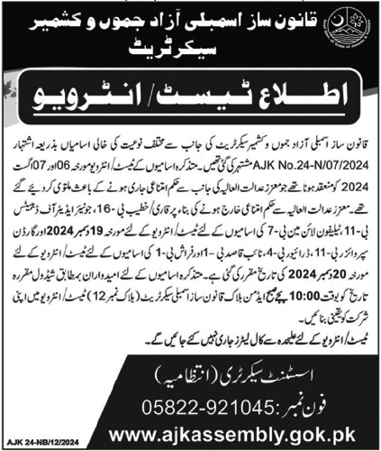 AJK Legislative Assembly invites applications for job positions advertised in daily Nawaiwaqt dated 18 December 2024 for following vacancies in Muzaffarabad, muzaffarabad AJK Pakistan.