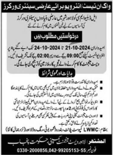 Latest Government walk in interview jobs in Lahore Waste Management Company in Labor and others can be applied till 24 October 2024 or as per closing date in newspaper ad. Read complete ad online to know how to apply on latest Lahore Waste Management Company job opportunities.