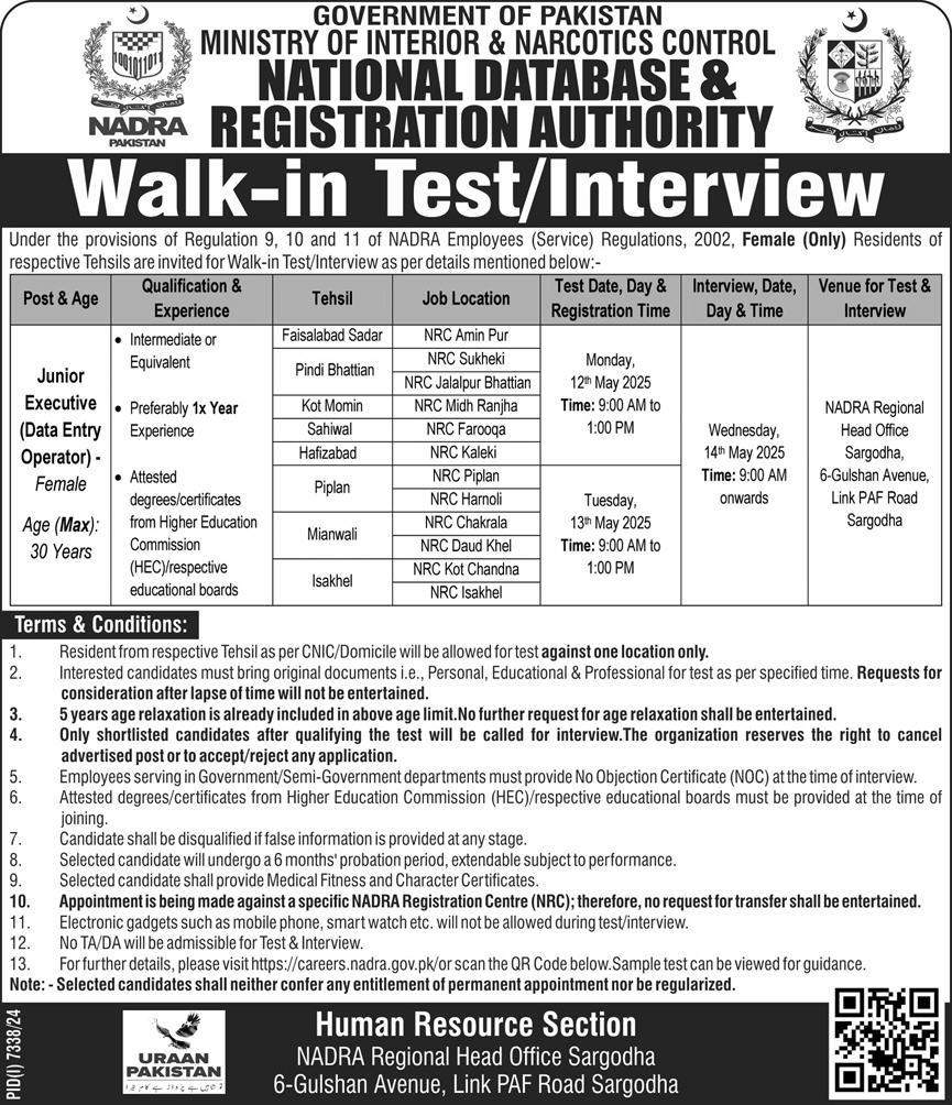 National Database & Registration Authority NADRA is looking for candidates for following posts as per job advertisement published in daily Express Newspaper of April 27, 2025 for location PAF Road Sargodha, sargodha Punjab Pakistan: